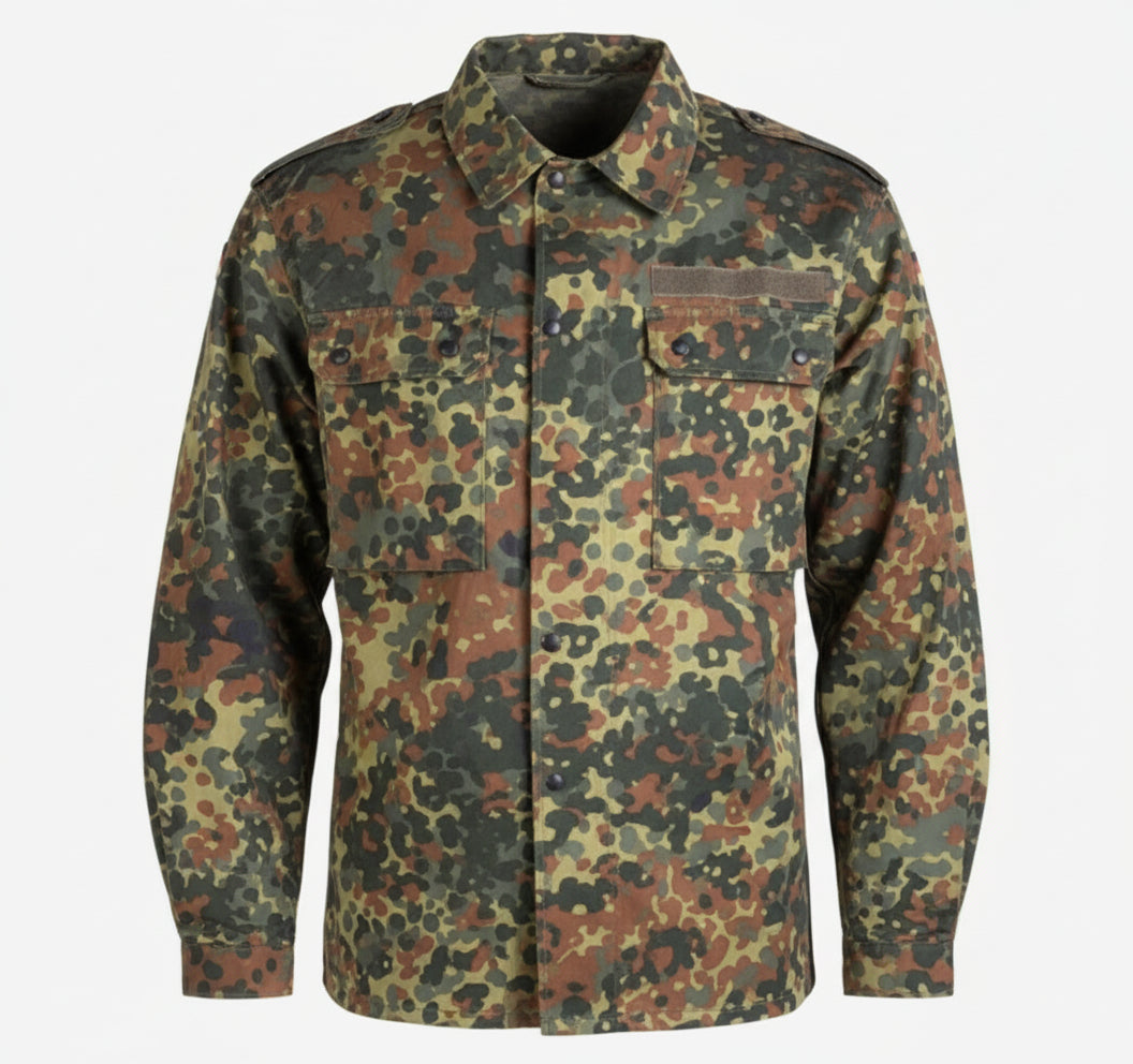 Тази впечатляваща риза с уникалния камуфлажен мотив Flecktarn е идеална както за трева, така и за гора. Здрав преден цип, защитен от ветроустойчив капак, закопчан с копчета тип „truk“. Джобовете на гърдите имат капаци и копчета. Ризата е в използвано състояние, прана. Удобна е на допир, подходяща за лятото, но също така и за леки студове и е много издръжлива.