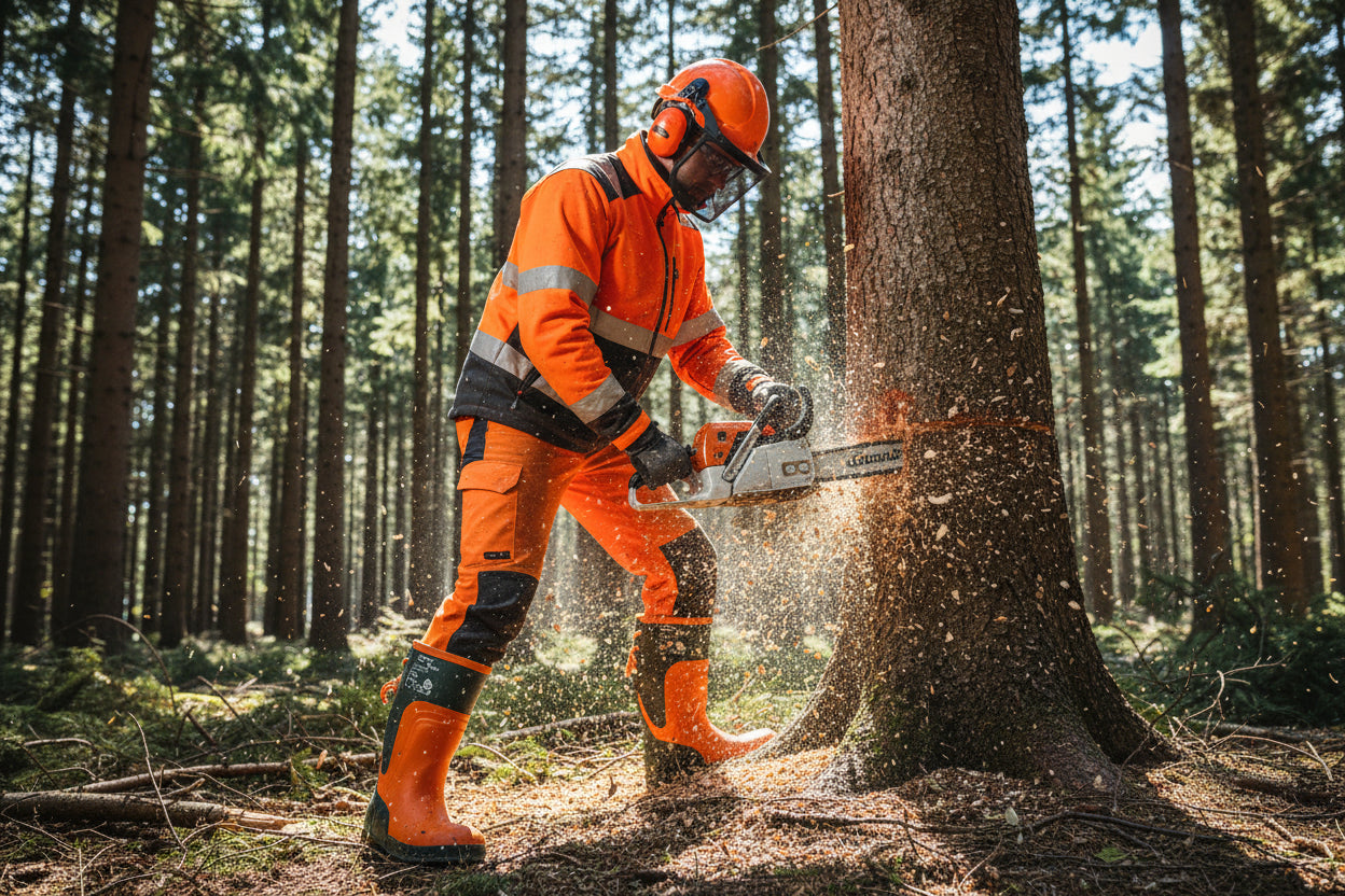 Ανθεκτικές μπότες ασφαλείας τύπου Lumberjack, σχεδιασμένες για σκληρή εργασία σε δάσος, χωράφι και δύσβατο έδαφος.
