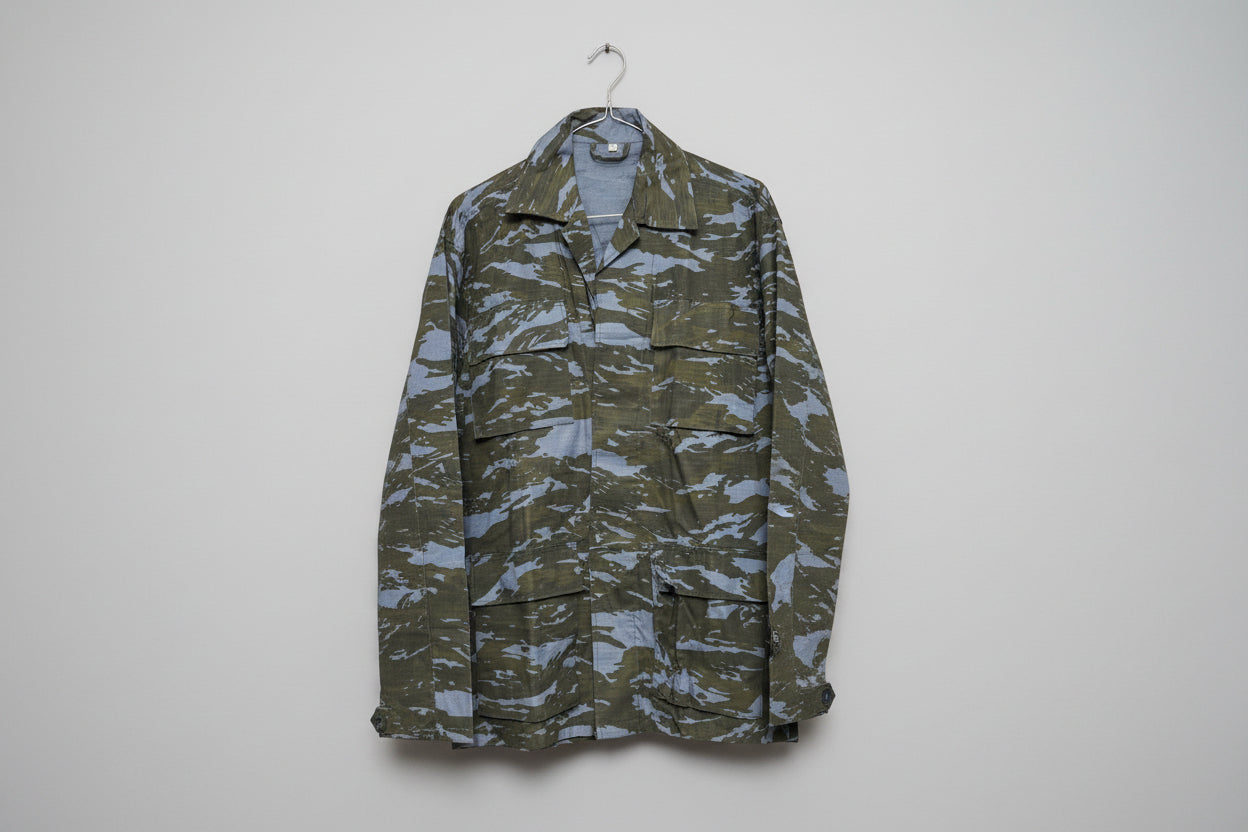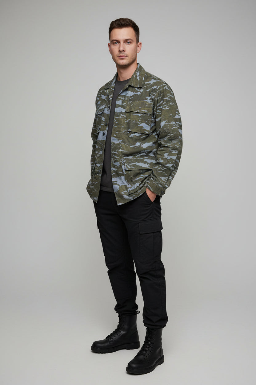 Jachetă de camuflaj rezistentă în tonuri de albastru, stil militar, ideală pentru muncă, activități în aer liber și utilizare zilnică în condiții solicitante. Construcție concepută pentru practicitate și confort, cu accent pe funcționalitate.